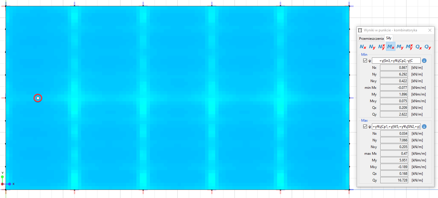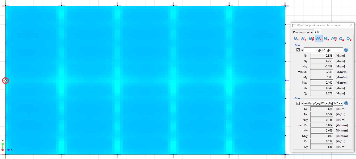 Powyższe rysunki przedstawiają mapy obwiedni minimalnych i maksymalnych momentów – tj. nie prezentują rozkładu sił w powłoce dla konkretnej kombinacji, a zbiór wartości ekstremalnych dla wybranego typu kombinacji obciążeń. Odczytując wynik w punkcie łatwo sprawdzisz dla jakiej konfiguracji grup obciążenia został on uzyskany.
